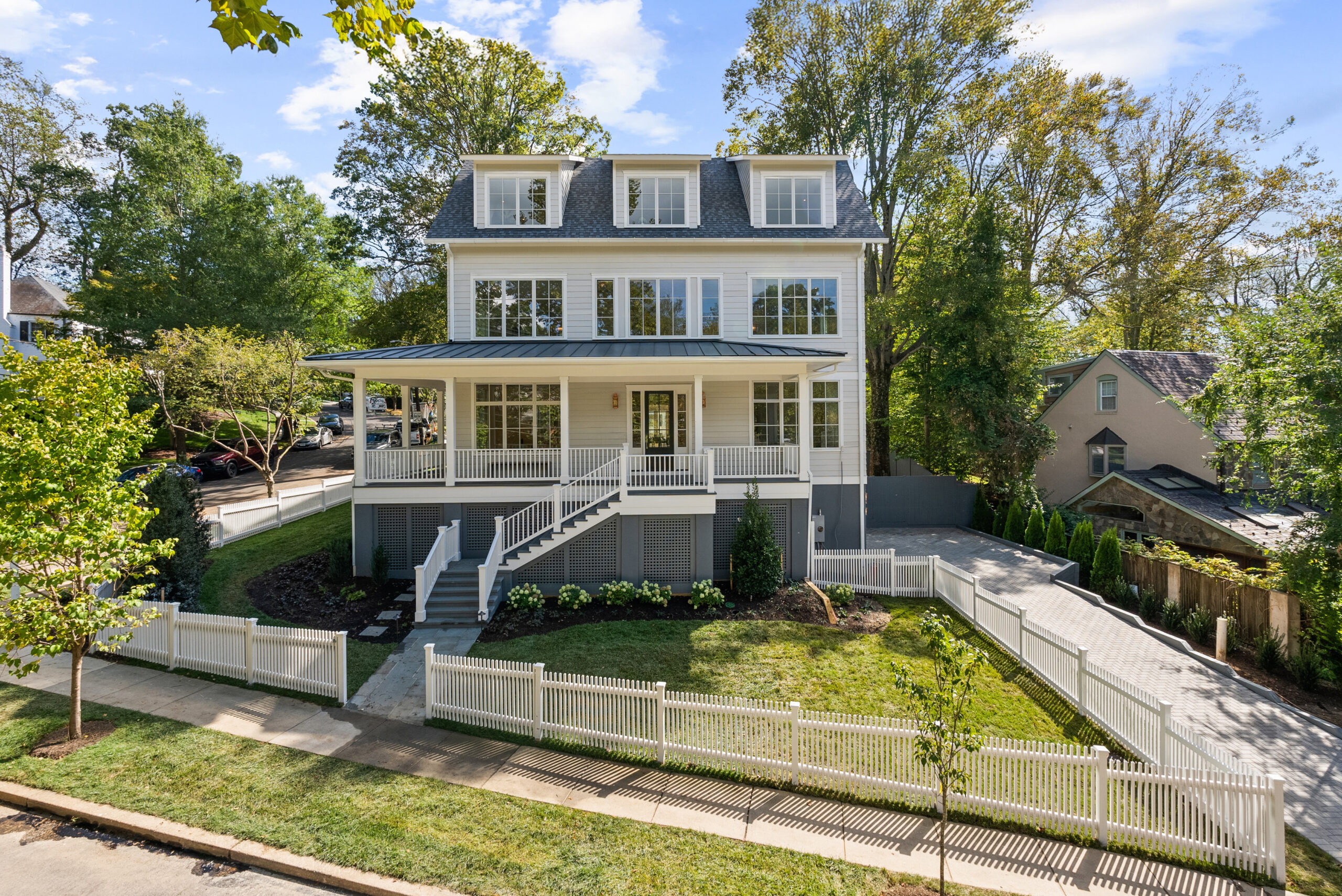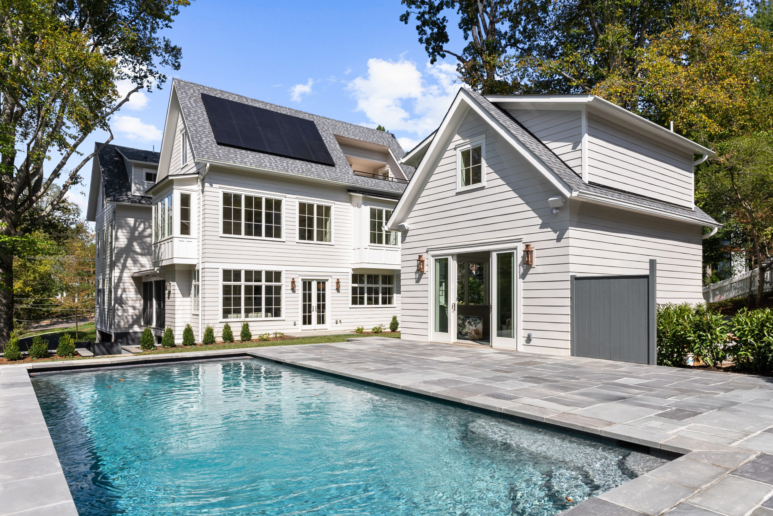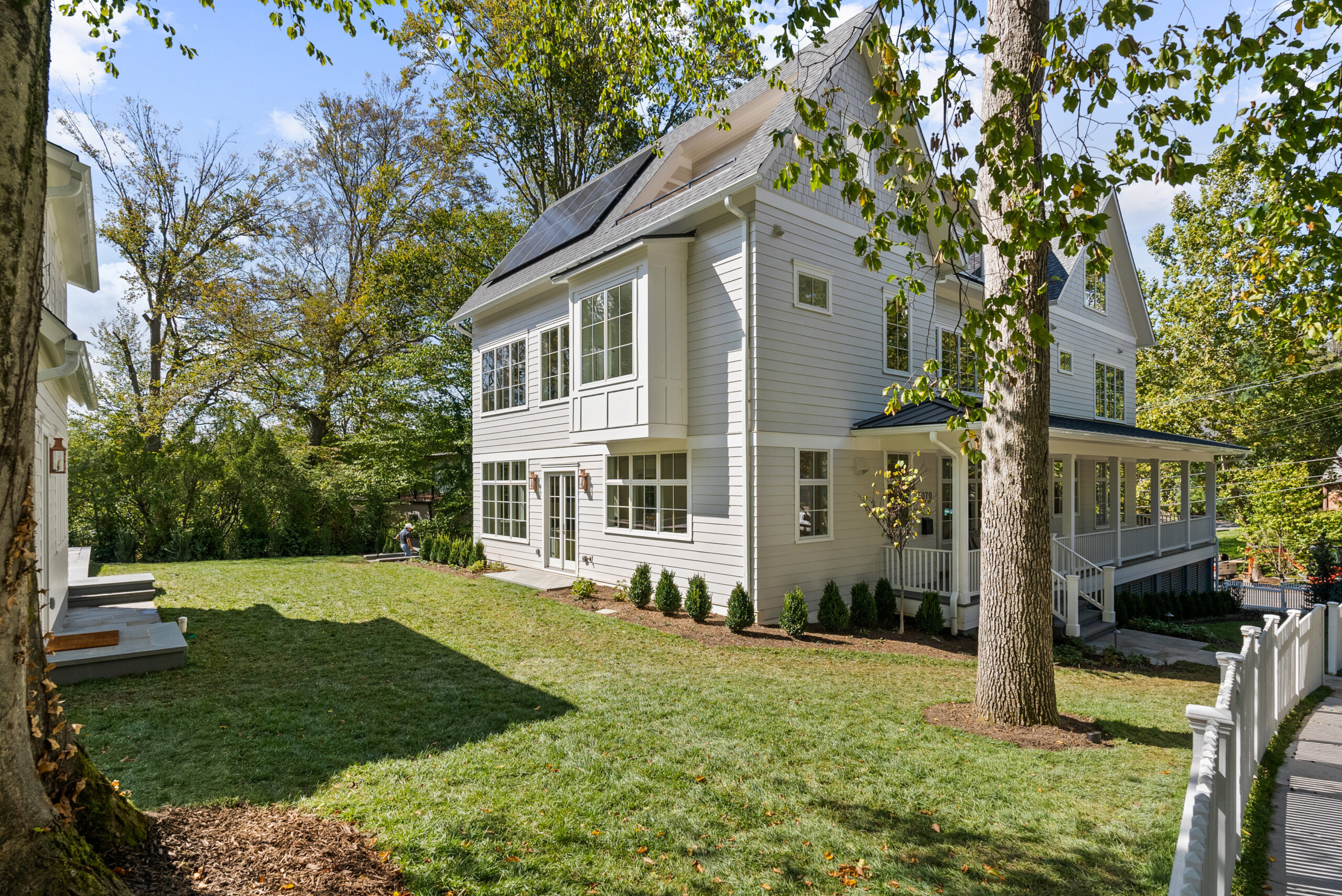 The home offers generous outdoor living with a large backyard, pool, and inviting front porch, all set among mature trees. Eco-conscious features include solar panels, battery back-up system, energy-efficient windows, spray foam insulation, and electric car charging capability. A state-of-the-art security system ensures both comfort and peace of mind in this premier DC residence.